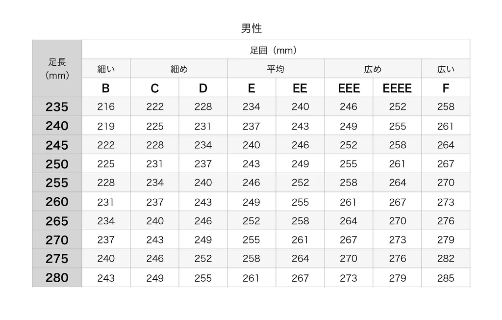 上記はワイズの早見表ですが、私はだいたい足長:25.5㎝、足幅:24.5㎝ほどなので、ちょうど日本人の平均と言われているD~Eワイズということですね。